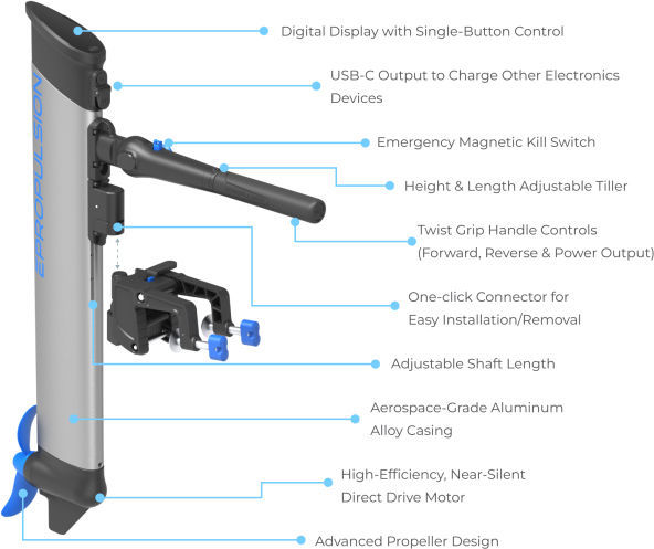 Ekstremt kompakt og transportvennlig elektrisk påhengsmotor fra ePropulsion! ePropulsion eLite bærer du enkelt med deg overalt. Superenkel i bruk! ePropulsion eLite er en superkompakt og lett alt-i-ett elektrisk påhengsmotor på 500 W. Motoren er enkel å bære med seg over alt, og kan bæres i rorkulten når den er felt ned. eLite er perfekt til gummibåter, små joller, kanoer og lignende. Både batteri og display er integret i den flyvingedesignede stammen. Stammedesignet gjør eLite svært slank og lekker. I tillegg fungerer stammen som et ror, som gir enda bedre styring. Motorbraketten har hurtigkobling, slik at du enkelt kan ta med deg motoren, og la braketten stå igjen på båten. Braketten kan festes til stammen i fire ulike høyder. Stammelengden kan dermed tilpasses til de aller fleste båter. Motoren kan brukes både i saltvann og ferskvann. Det integrerte batteriet gir en driftstid i standardmodus på ca 40 minutt på høyeste effekt, og ca 3,5 timer på laveste effekt. På full effekt vil båten kunne gjøre ca. 4 knop. Disse testene er gjort med en 2,5 m lang aluminiumsjolle med én person ombord kjørt på en rolig innsjø. Driftstid og fart i andre situasjoner vil naturlig nok kunne variere. - Effekt: 500 W (750 W i sportsmodus) - Batterikapasitet: 378 Wh - Kjøretid: 0:40 - 3:24 avhengig av bl.a. båt, gasspådrag og utetemperatur - Vekt, eks. brakett: 6,7 kg - Vekt, ink. brakett: 7,79 kg - I pakken: Motor med brakett, 220V AC lader, bærebag, magnetisk dødmannsknapp m/håndstropp og bruksanvisning.